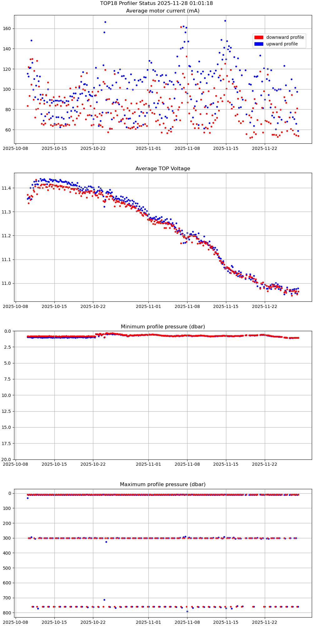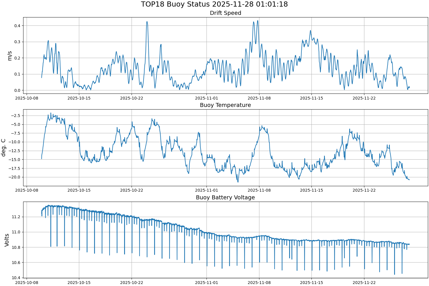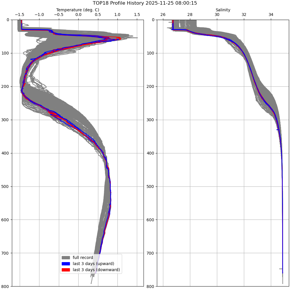 TOP 18 was deployed on 45cm thick ice in a variable thickness ice floe on 9 October 2025 at 76° 5.886’ N, 132° 56.280’ W as part of the Beaufort Gyre Observing System (BGOS) cruise on the CCGS Louis S. St. Laurent heavy icebreaker. The TOP began operating on a sampling schedule of 6 two-way or “yo-yo” profiles between 1 and 760 meters each day.