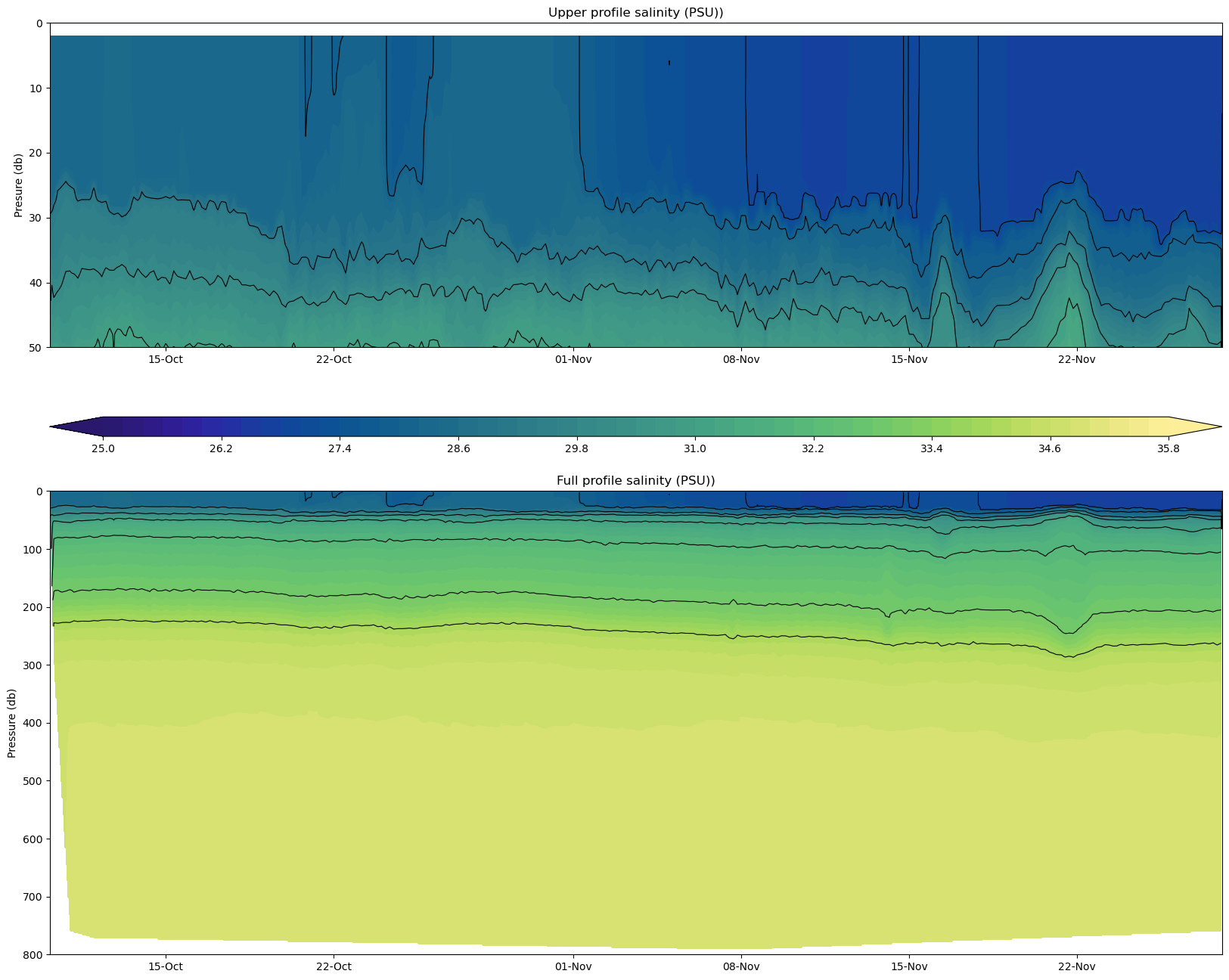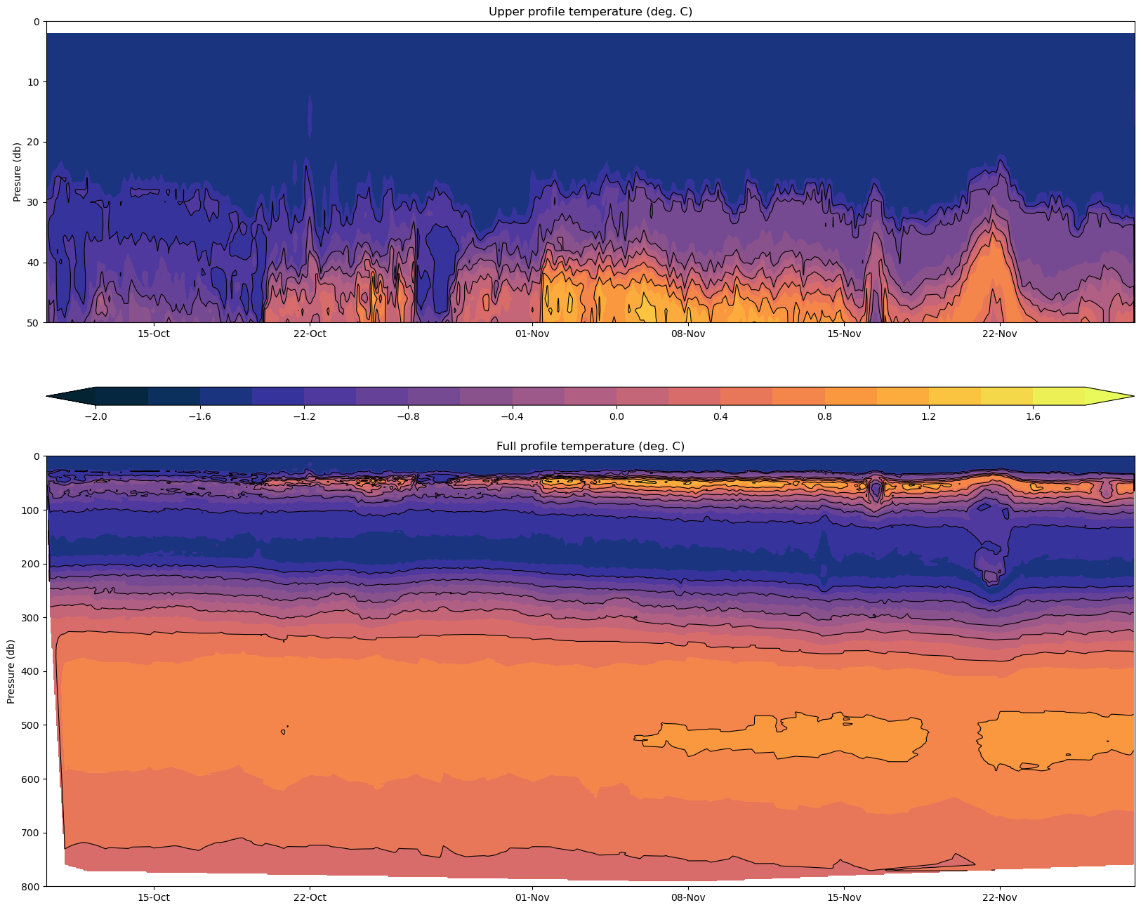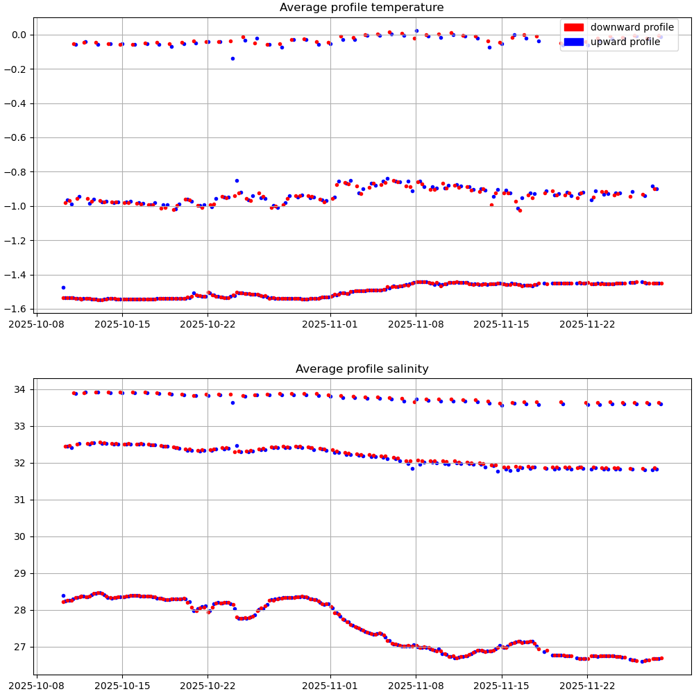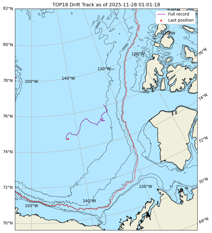 TOP 18 was deployed on 45cm thick ice in a variable thickness ice floe on 9 October 2025 at 76° 5.886’ N, 132° 56.280’ W as part of the Beaufort Gyre Observing System (BGOS) cruise on the CCGS Louis S. St. Laurent heavy icebreaker. The TOP began operating on a sampling schedule of 6 two-way or “yo-yo” profiles between 1 and 760 meters each day.
